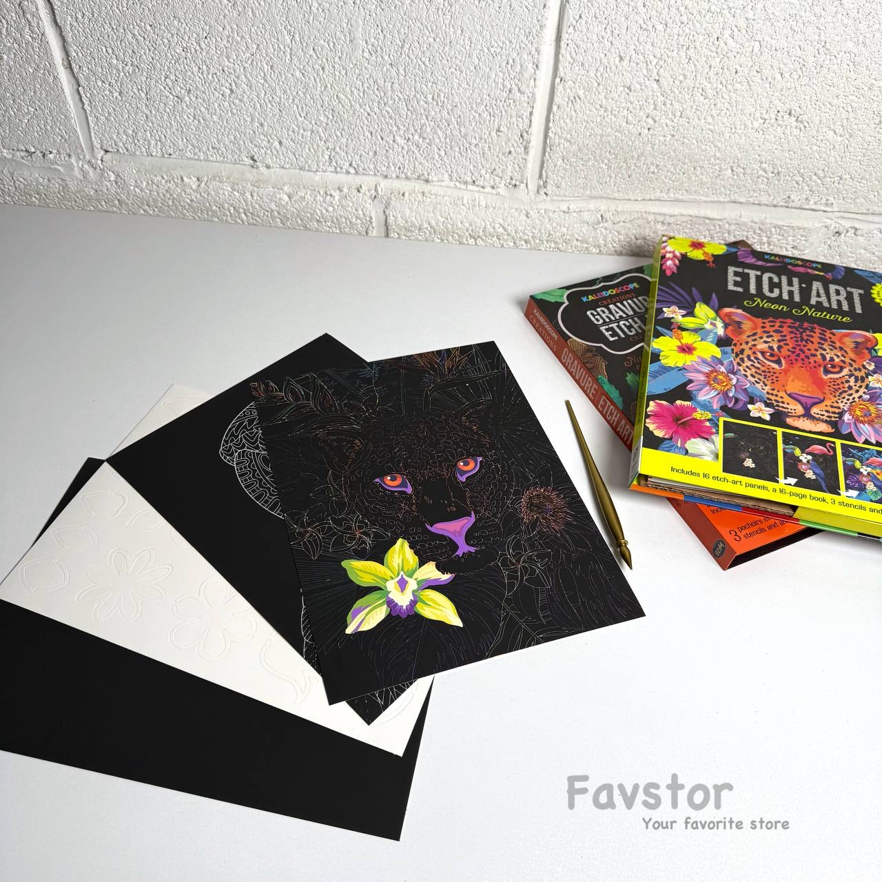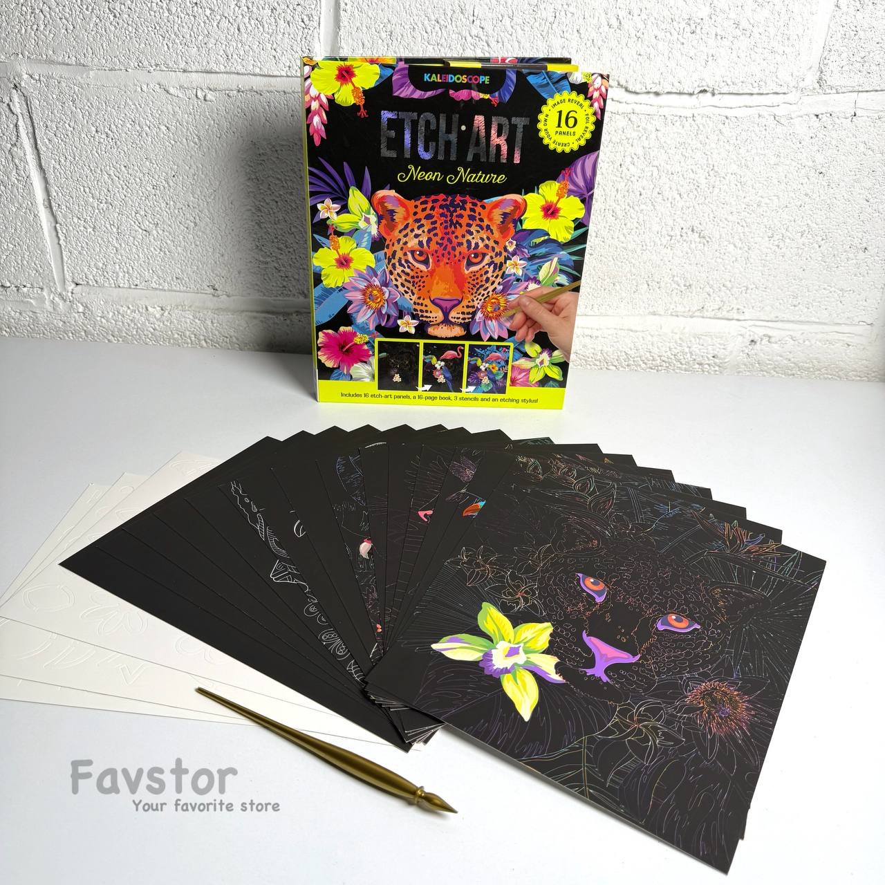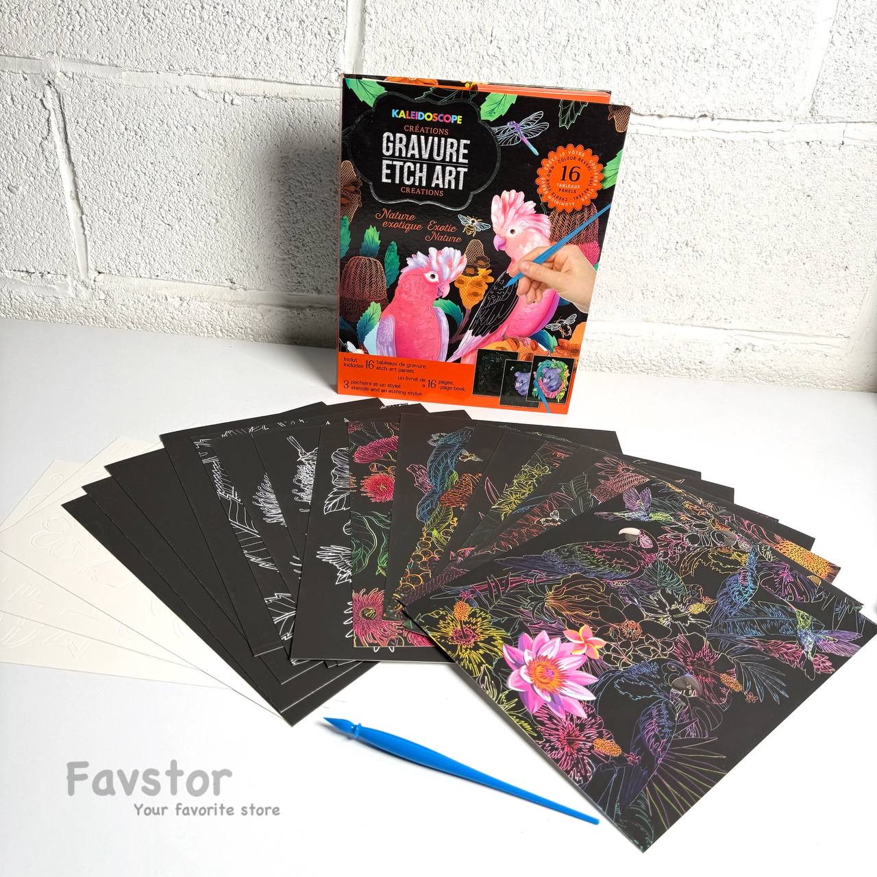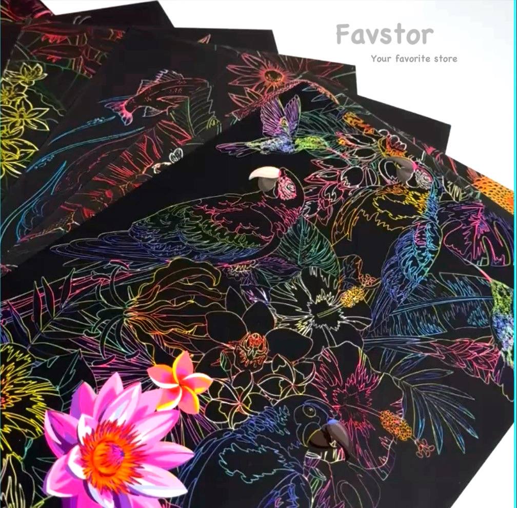 هر ست شامل 16 عدد کارت اسکرچی، 3 برگ شابلون، یک قلم مخصوص و دفترچه راهنما